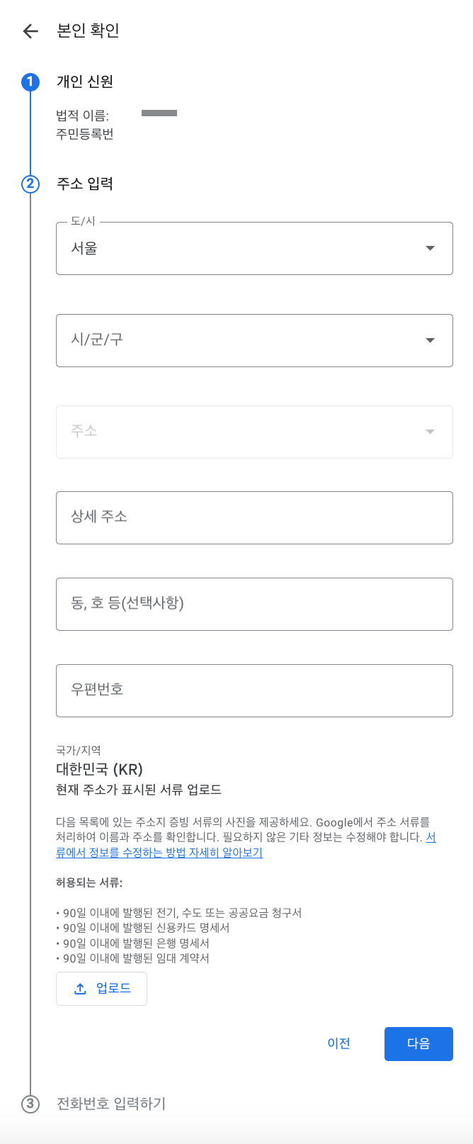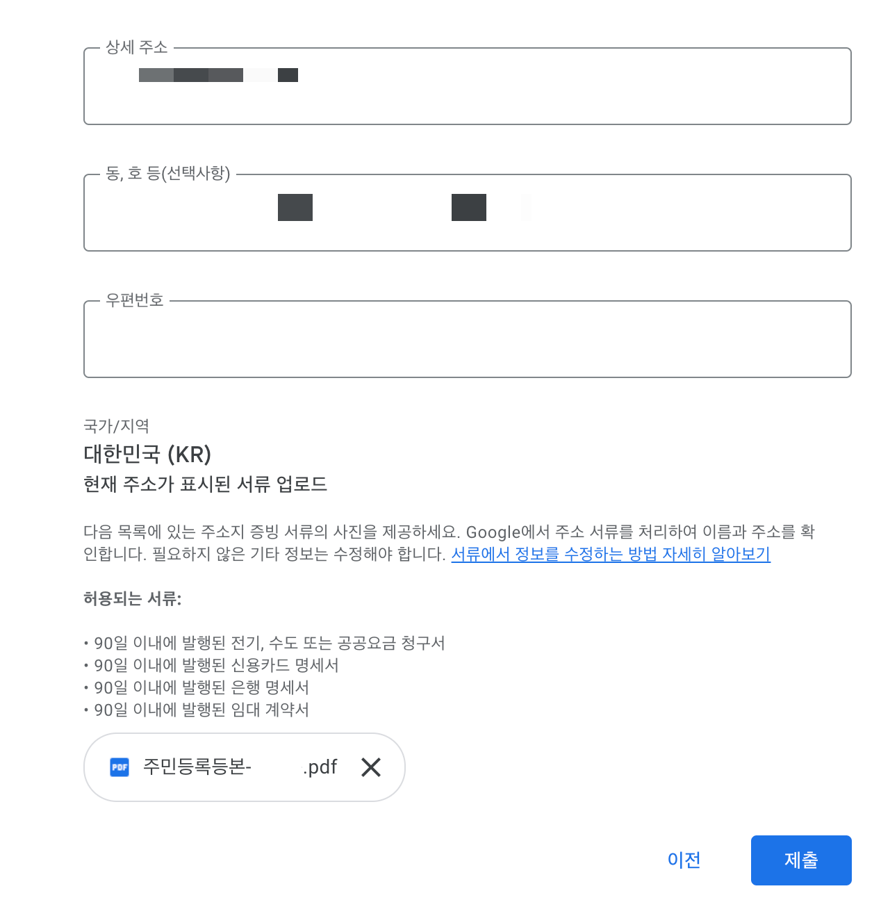 내 이름과 주소가 적힌 허용되는 서류가 마땅하지 않아 결국 주민등록등본을 업로드하여 다시 인증을 시도했다.