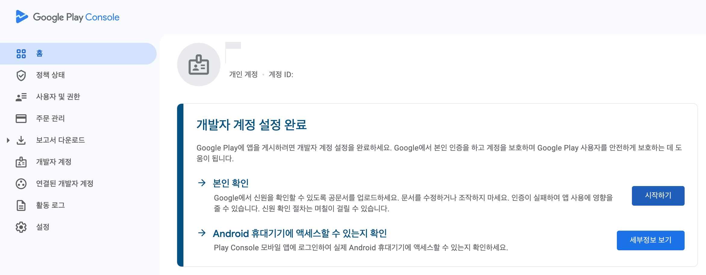 개발자 계정 설정을 완료하면 모든 작업이 완료된다. 신원을 확인하기 위해 시작하기 버튼을 누른다.
