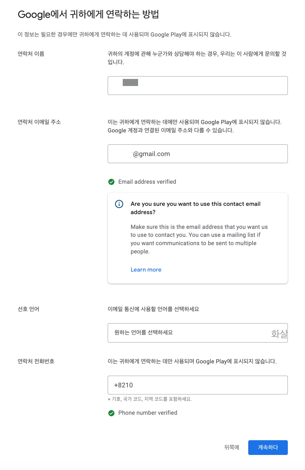 공개 개발자 프로필을 생성한다. 사용자가 문의할 때 사용할 수 있는 이메일을 입력하고 인증번호를 통해 인증을 완료한다.