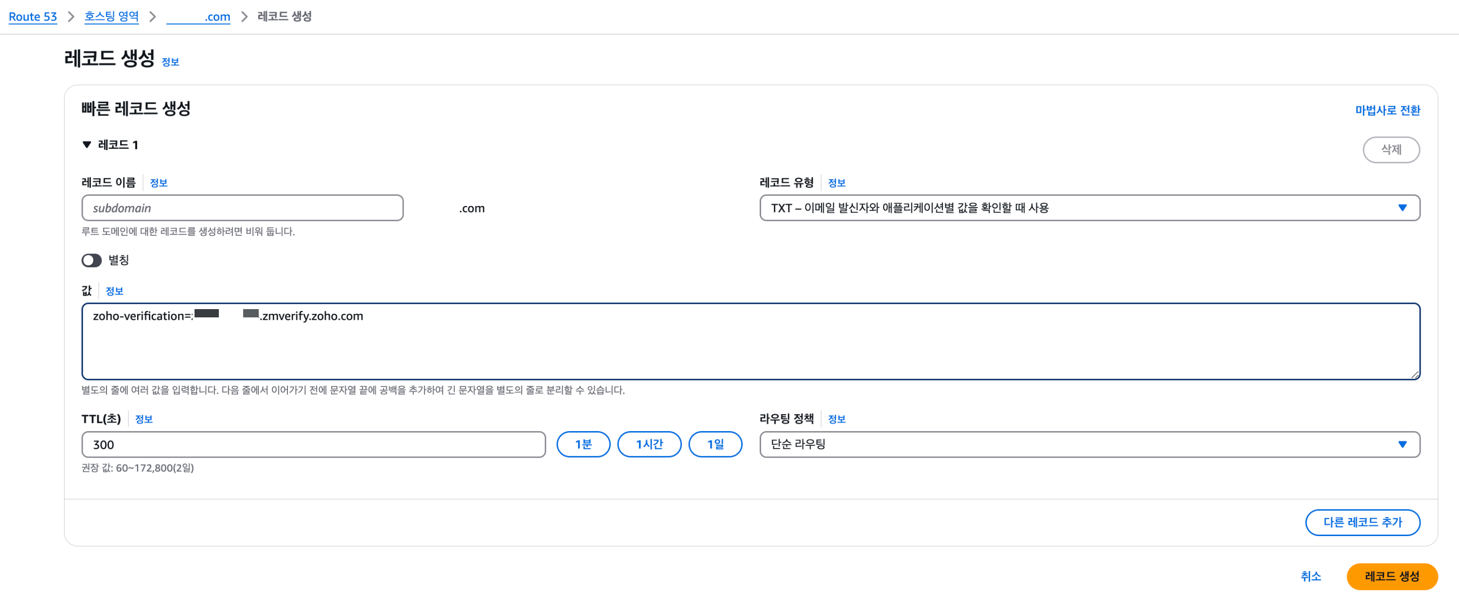 마지막 TXT 레코드는 레코드 이름(호스트)과 값을 입력하여 생성한다.
