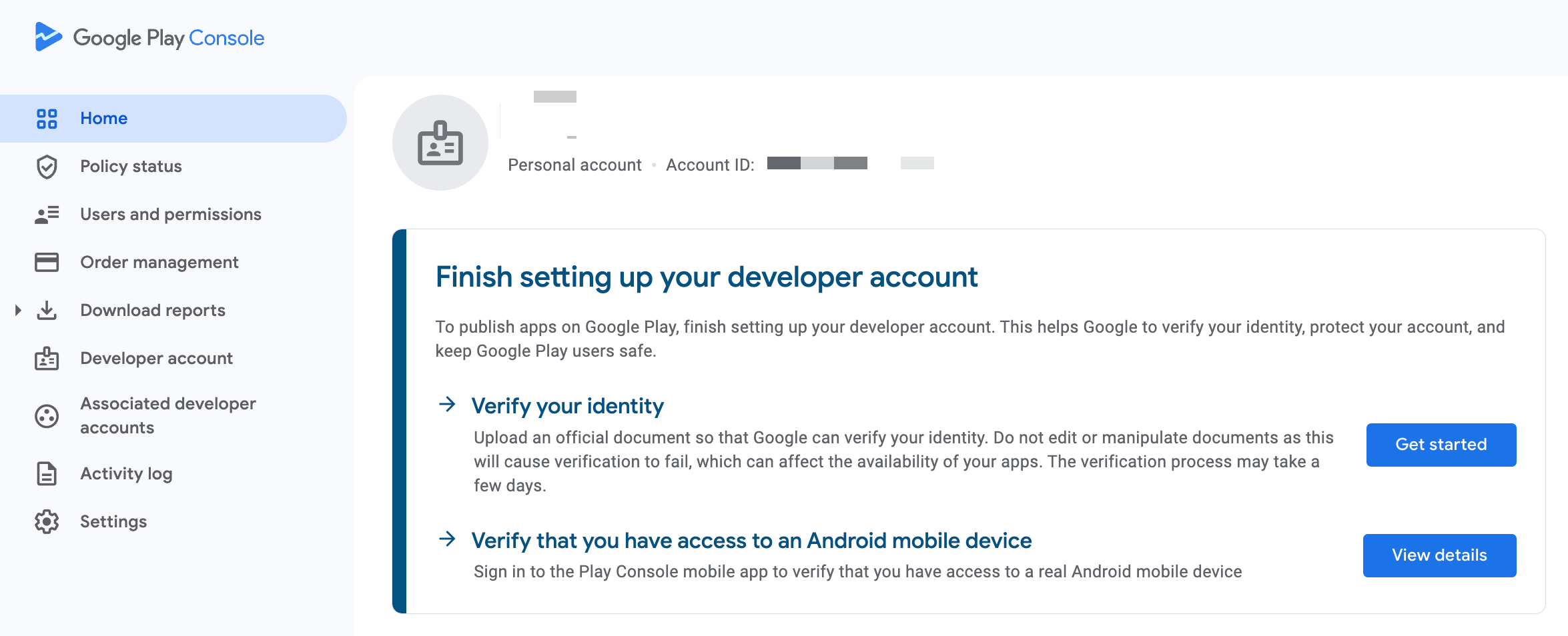 오른쪽 상단의 Manage deveoloper accounts를 클릭하여 Google Account로 이동한다.