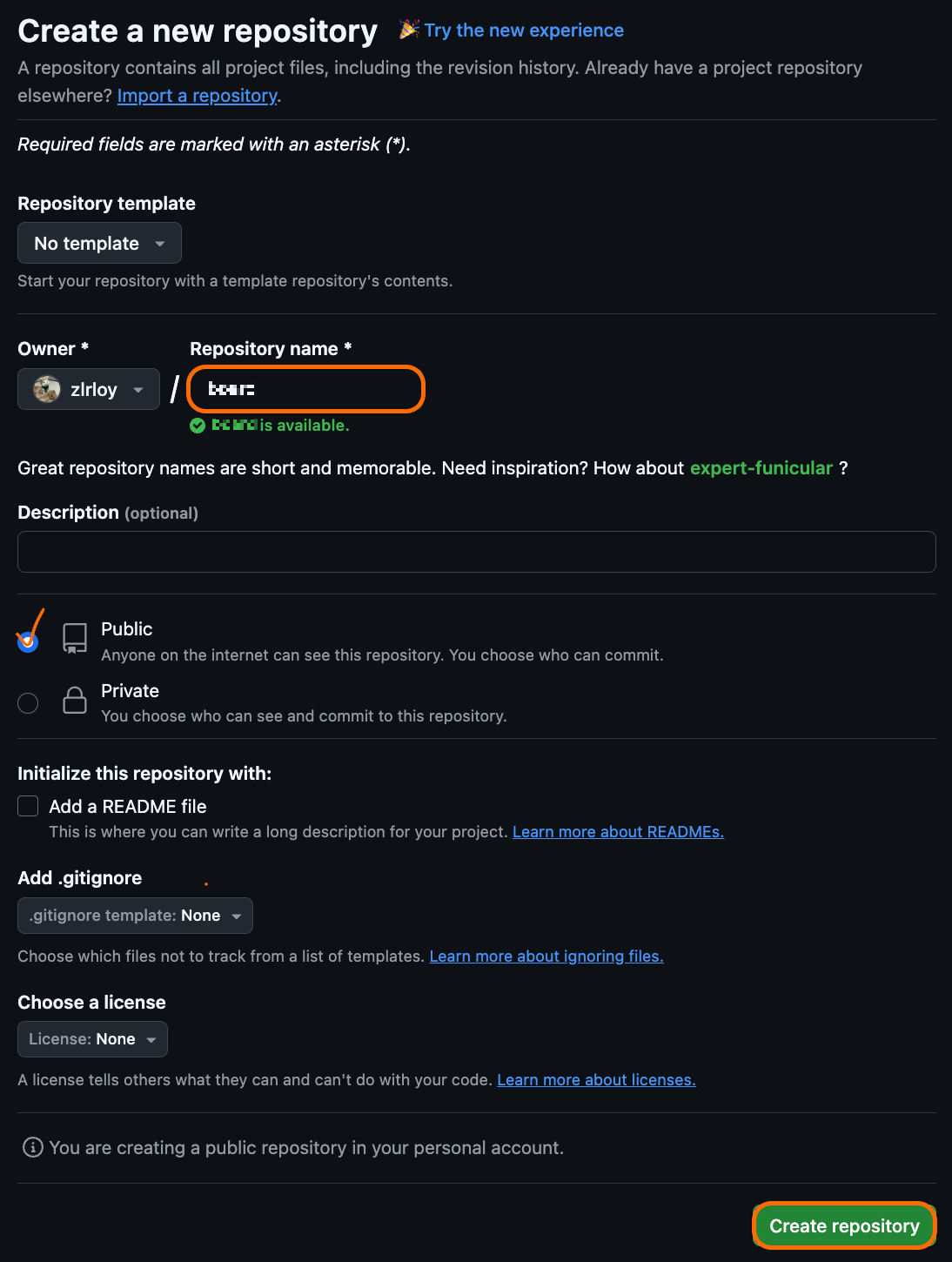 Repository name을 입력하고 해당 레포지토리 공개여부를 선택한 뒤 Create repository 버튼을 클릭한다.