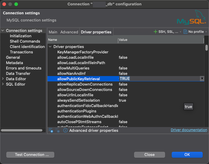 Connection settings - Driver properties 에서 allowPublicKeyRetrieval을 TRUE로 수정 - OK