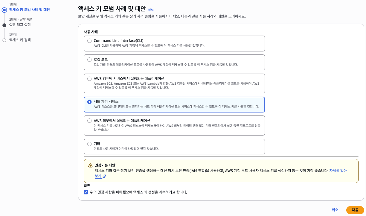 액세스 키 사용자를 선택한다. (없다면 사용자 생성)