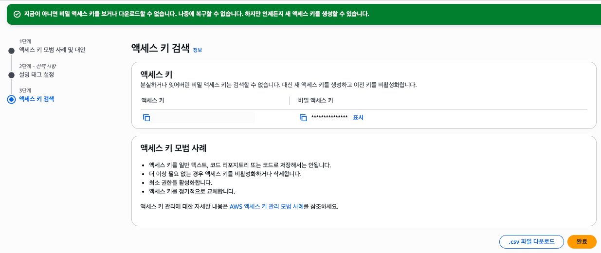 * 파일로 다운로드하려면 .csv 파일 다운로드를 눌러 안전한 위치에 키를 저장한다.