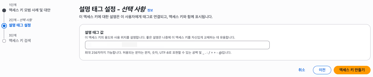 (선택사항)액세스 키에 대한 설명을 작성한 다음 액세스 키 만들기 버튼을 누른다.