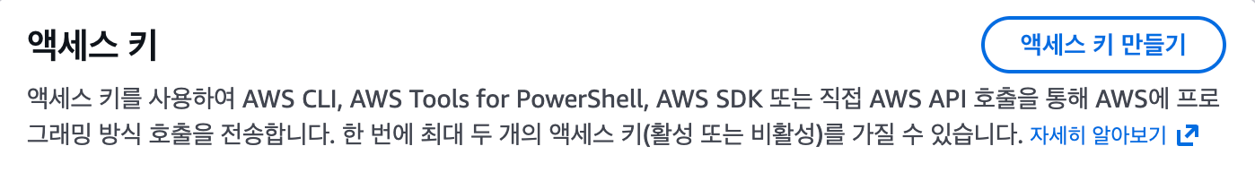 사람이 아닌 프로그램이 AWS를 제어하기 위해서는 아이디/비밀번호 대신 액세스 키+시크릿 키를 사용한다.
