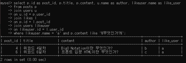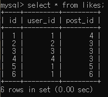 likes의 post_id를 보면 3(3번),4,5,6 id의 게시글인 것을 확인할 수 있다.