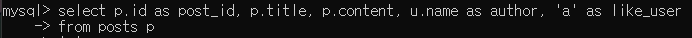 column에 임시값으로 넣어주었던 'a'를 likeuser로 수정하고 좋아요를 누른 user의 이름을 알기 위해 likes.user_id와 조인한다.
