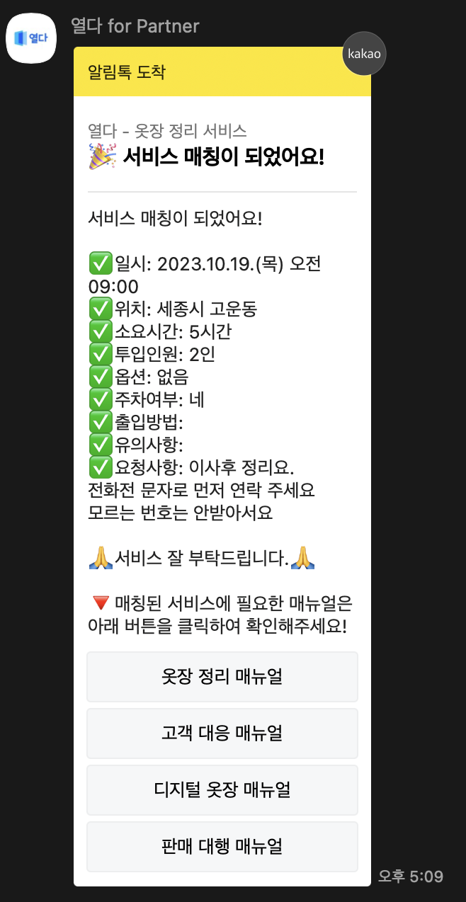 이 기업은 일반고객과 서비스매니저 두 부류의 user가 있으며 각각 서비스에 맞게 알림톡을 발송한다.