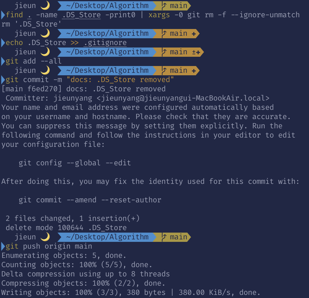 1. 현재 및 하위 디렉토리에 '.DS_Store' 파일을 모두 찾아 Git에서 삭제한다.