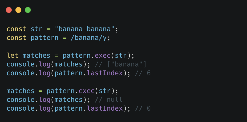 첫 번째 exec() 호출에서는 "banana"를 찾고, lastIndex 속성은 다음 검색 시작 위치를 나타내는 6이 된다.