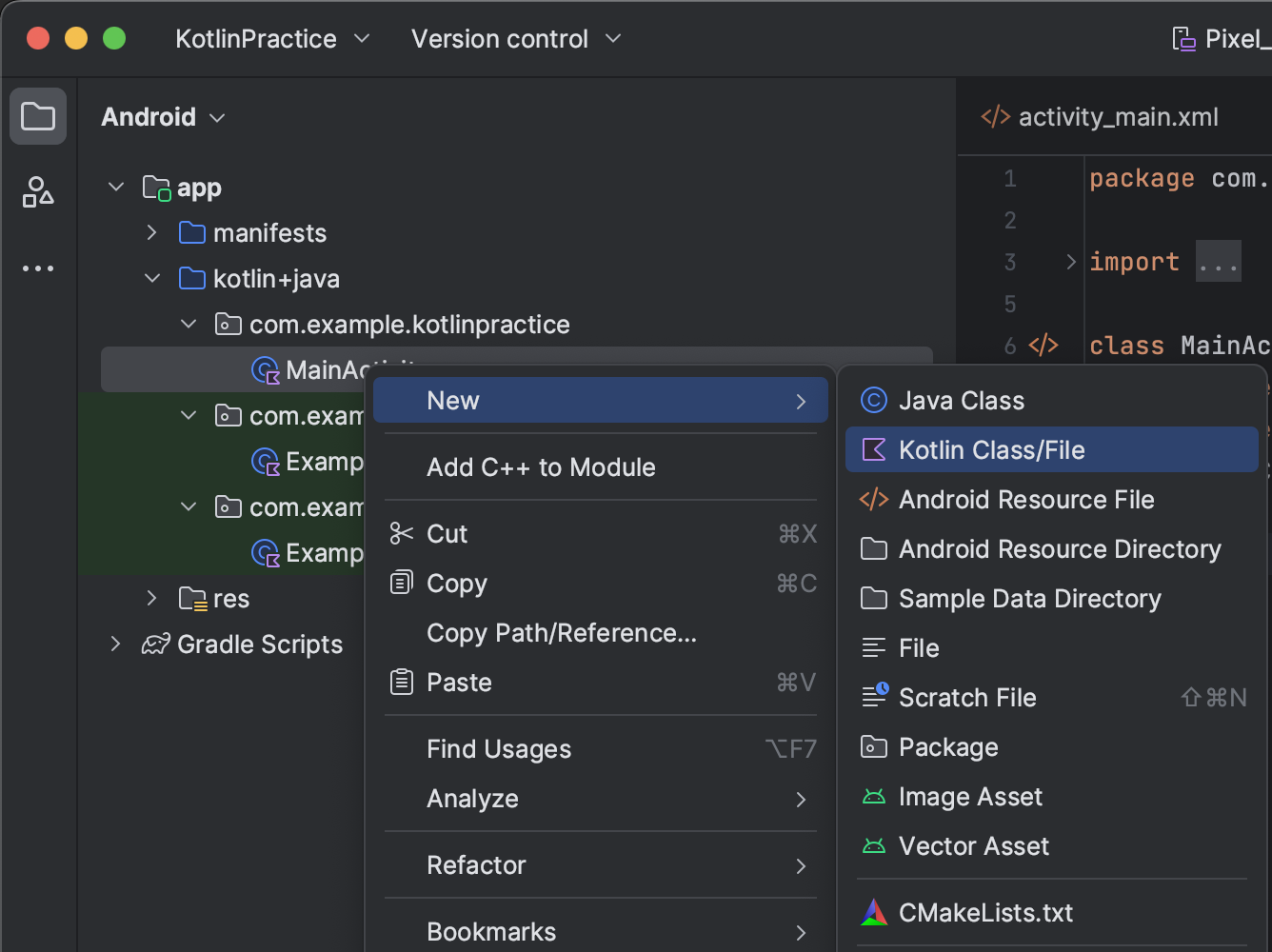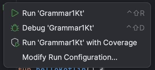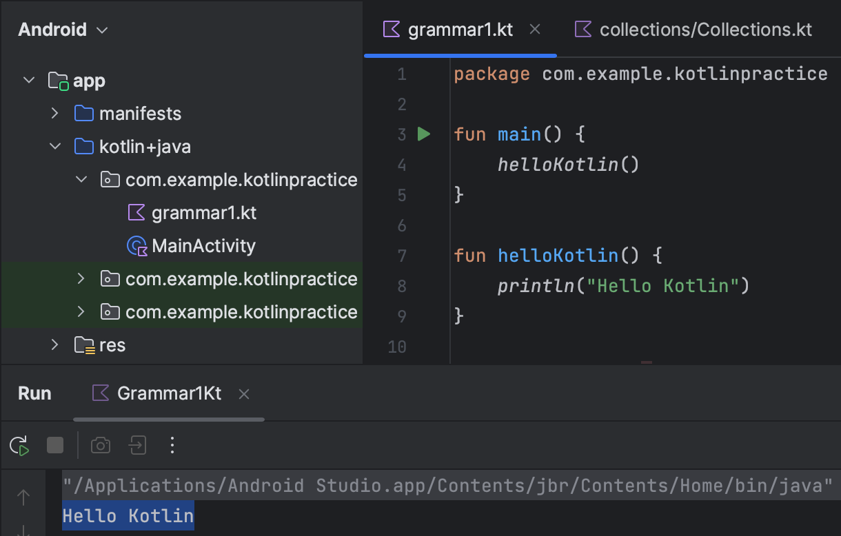fun main() 옆에 ▶︎ 화살표를 클릭하면 Run 할 수 있다.