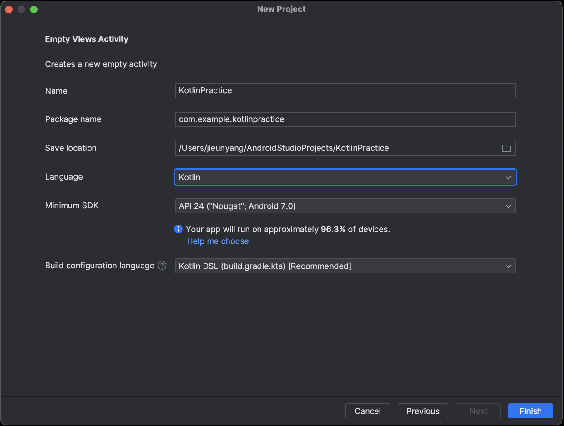 프로젝트명(Name)을 작성하고 Language를 Kotlin으로 설정한다.