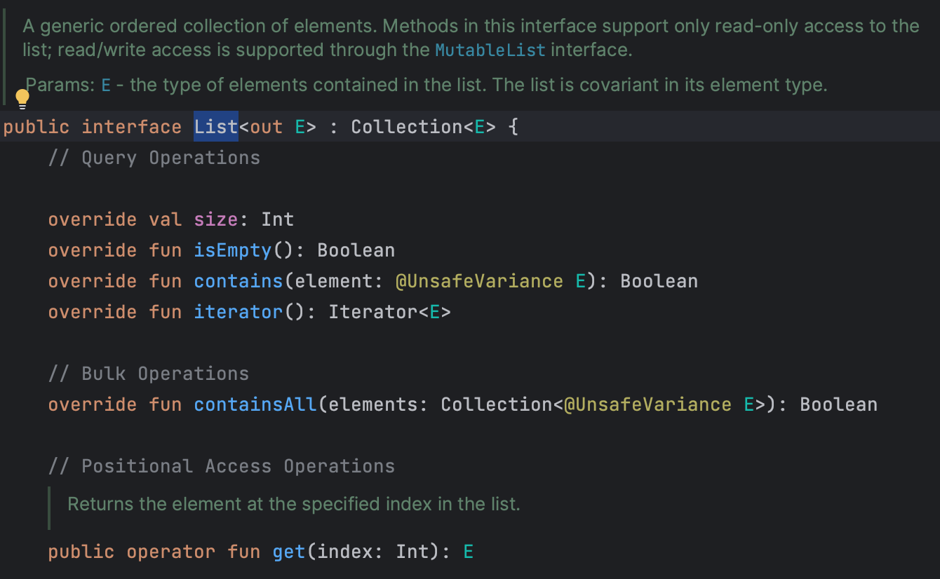 list의 interface를 보면 get은 가능하지만 set은 불가능하다. (참고: listOf를 command로 누르면 List interface에 접근할 수 있다.)