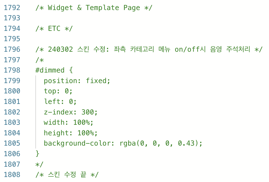 CSS에서 #dimmend를 찾아 /*와 */로 감싸준다.