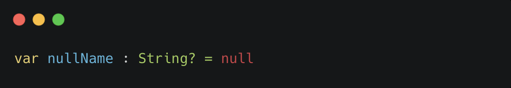 String 타입 옆에 '?' 물음표를 붙이면 Nullable 타입이 된다. (물음표를 넣어줘야 하기 때문에 타입을 생략하면 안됨)