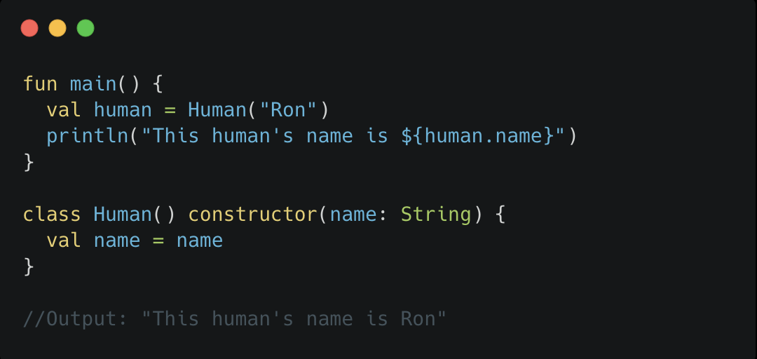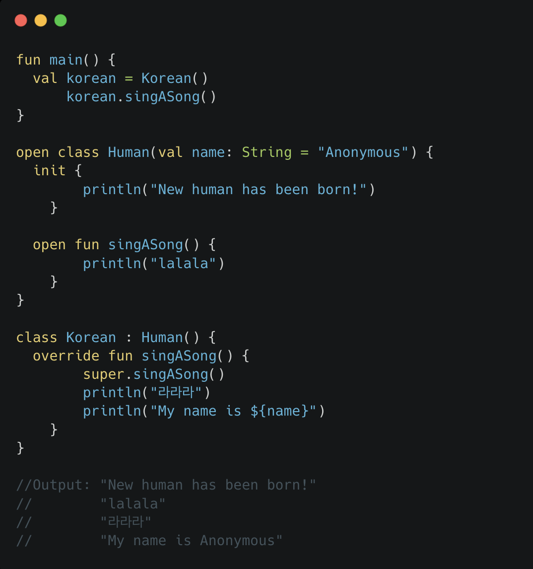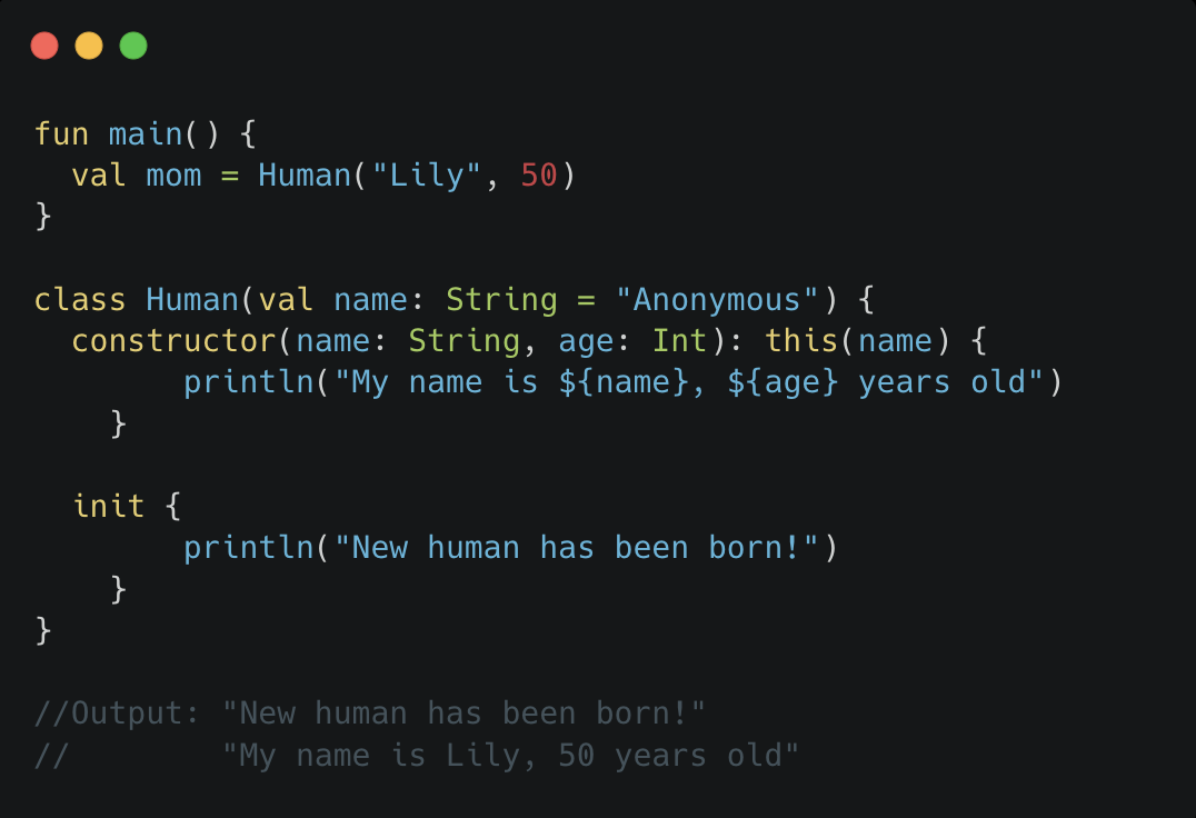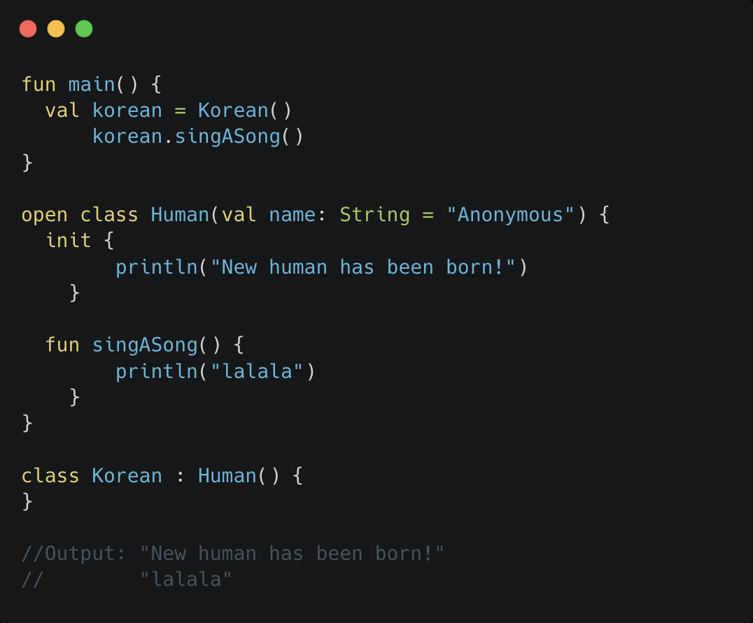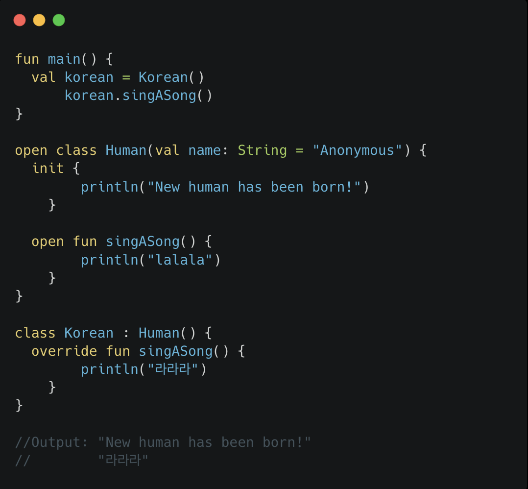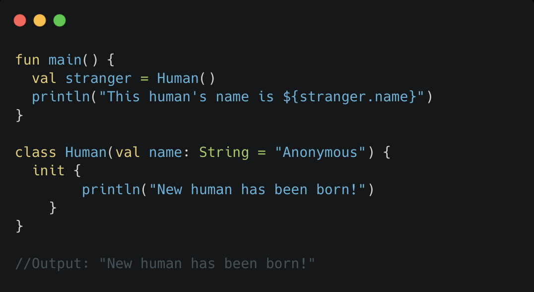 1️⃣ 코틀린에서 init은 클래스의 인스턴스(ex. Human)가 생성될 때 실행되는 코드를 포함할 수 있다.