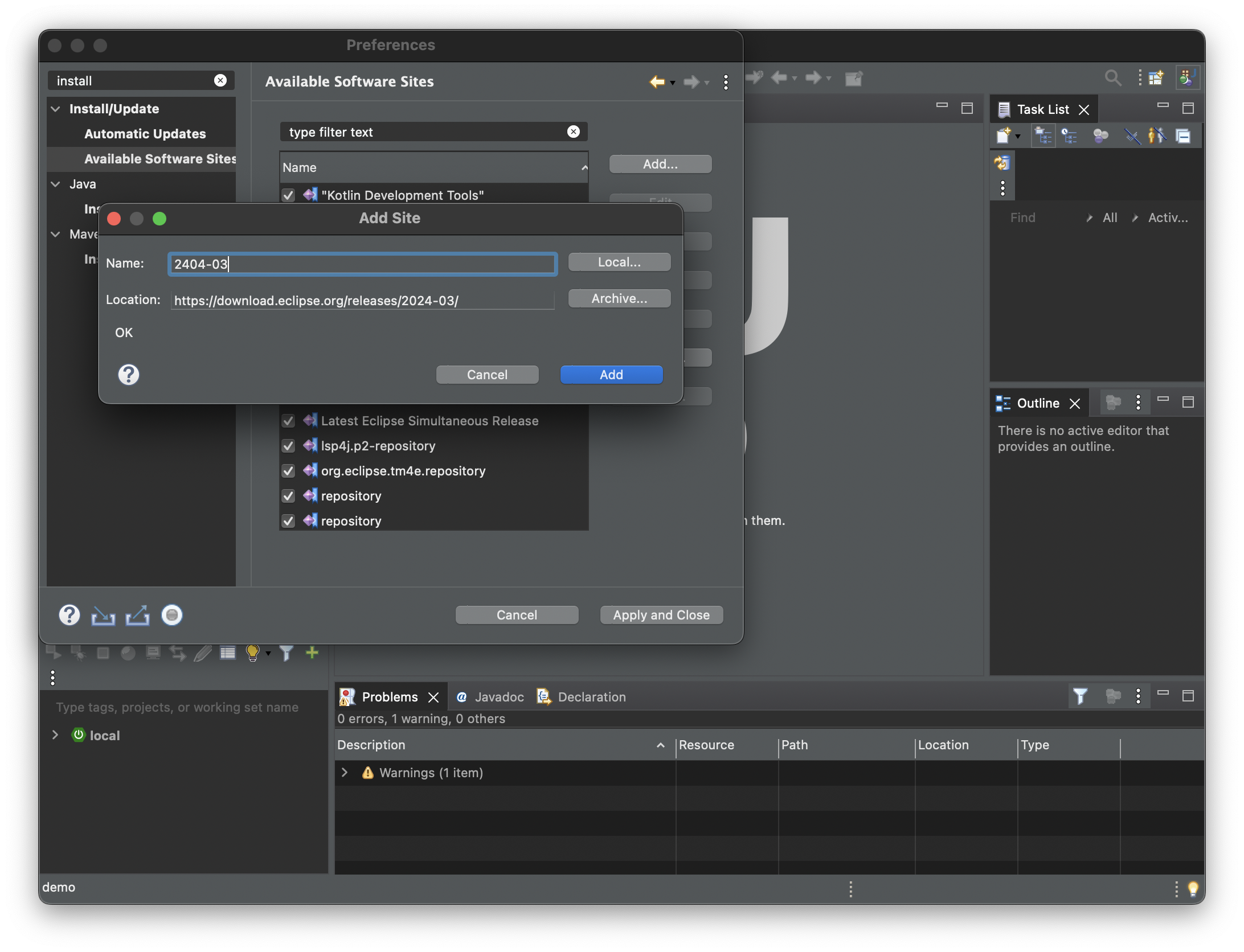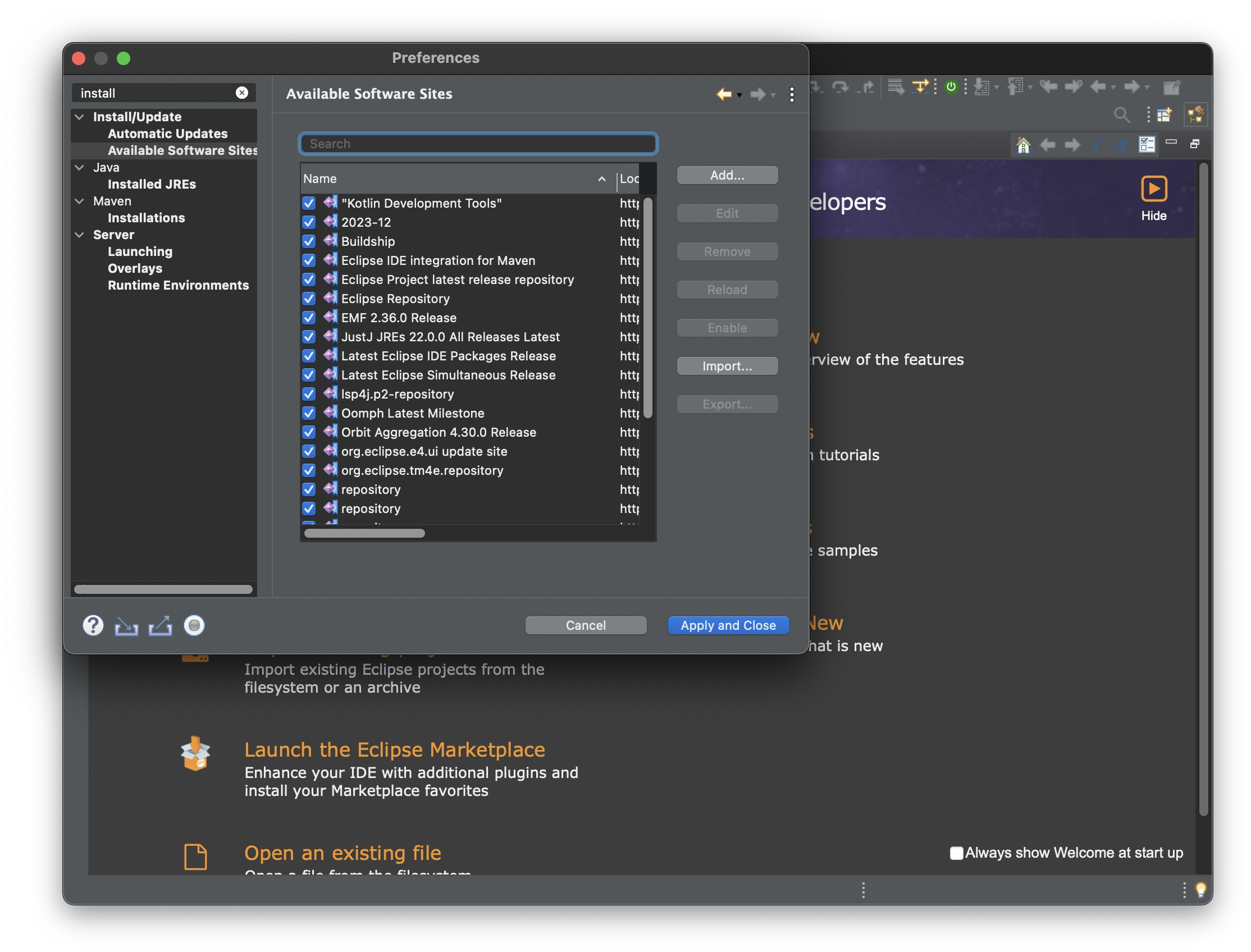 Eclipse - Settings...(⌘ ,) - Preferences - Install/Update - Available Software Sites - Add...