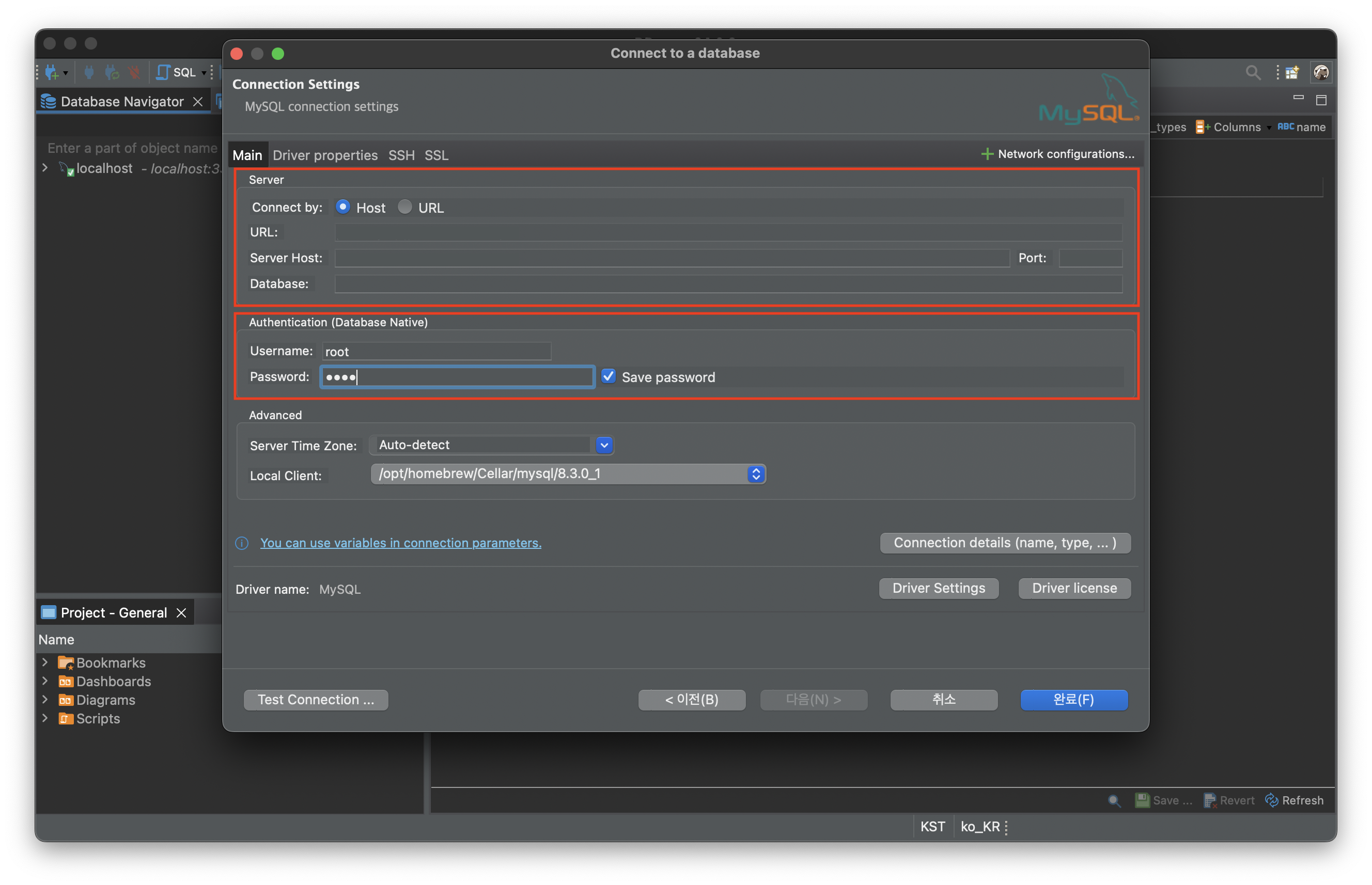 DB 호스트와 Username, Password를 입력 후 완료 버튼을 누른다.