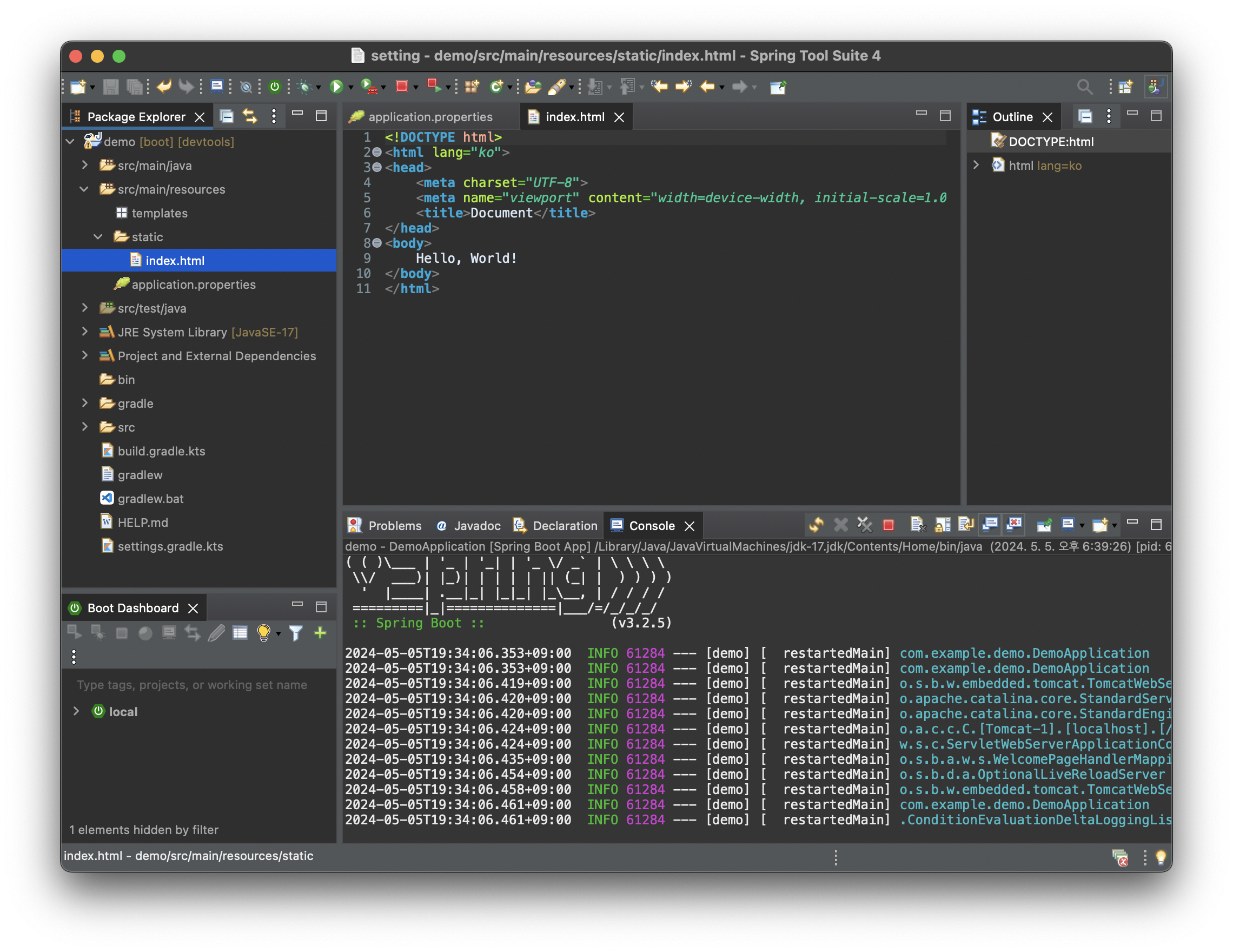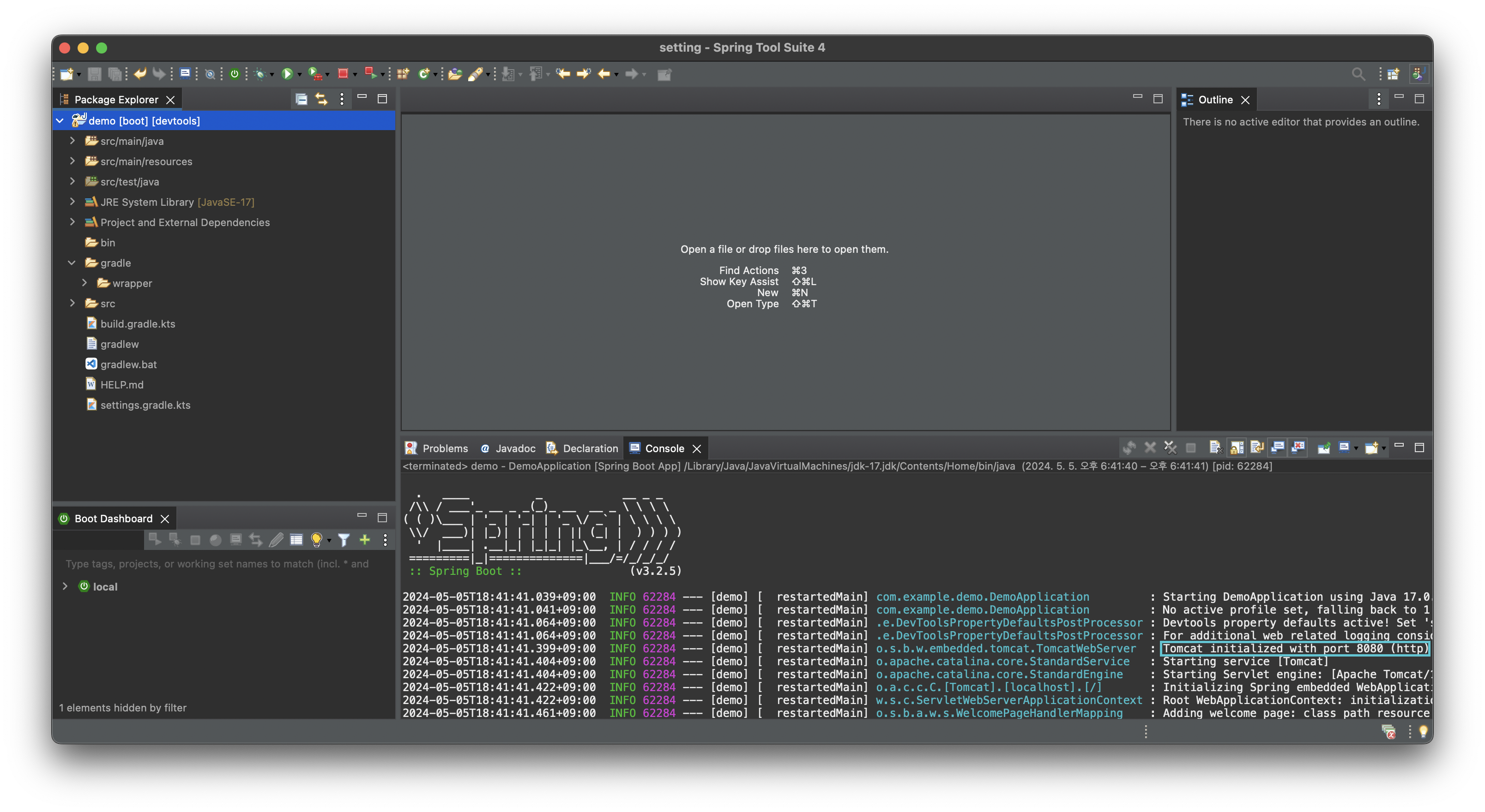 오른쪽 하단을 보면 포트 8080으로 서버가 실행되었다는 메세지가 있는데