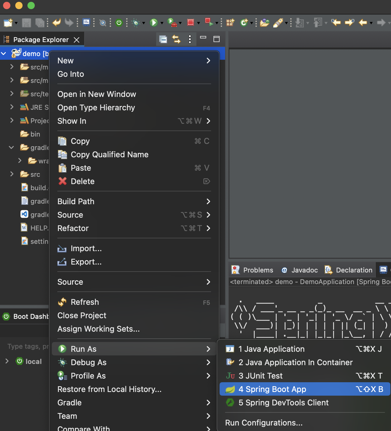 폴더 - 우측 마우스 - Run As - 4 Spring Boot App 를 눌러 생성된 프로젝트를 실행해보자