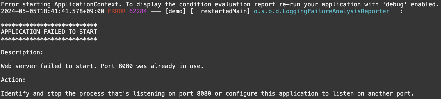 만약, 포트 8080이 이미 사용중이라는 오류메시지가 뜬다면