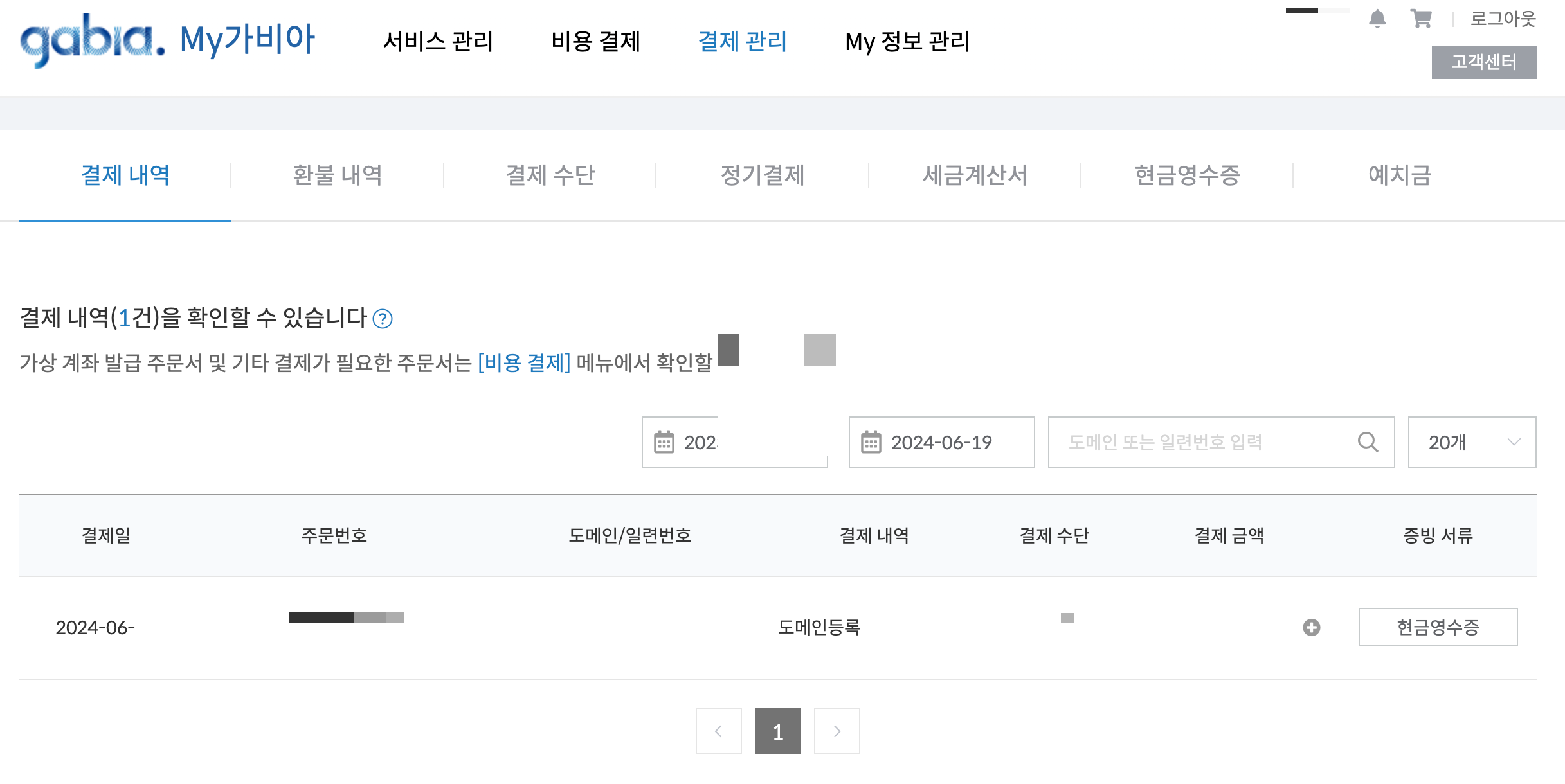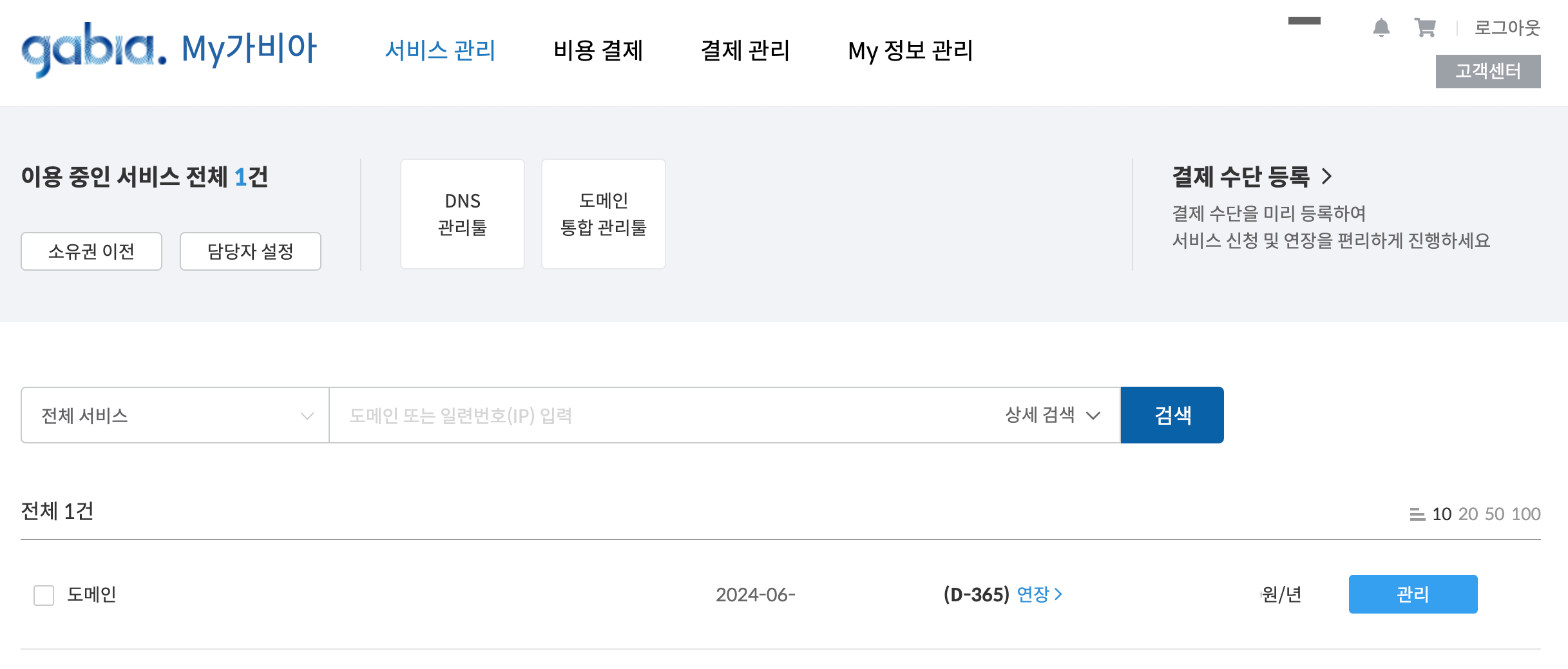 가비아 서비스 관리 - 관리 버튼 클릭