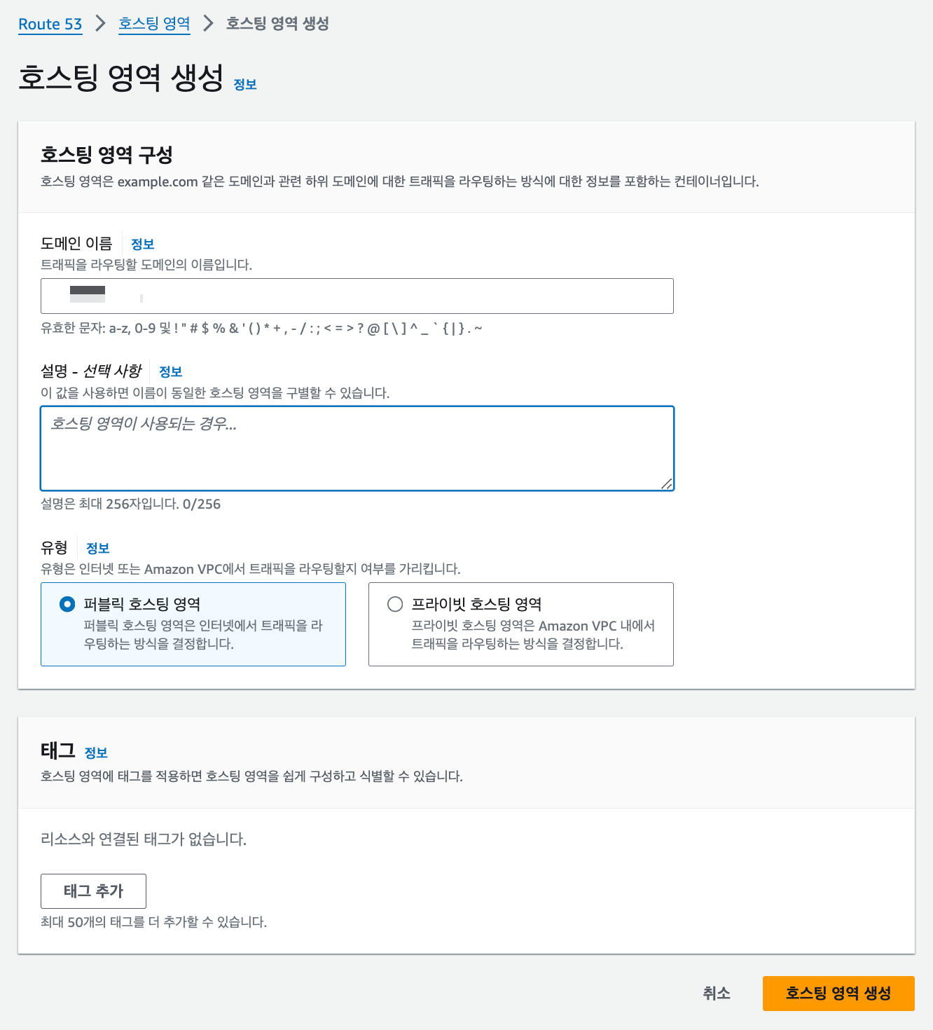 구매한 도메인 이름을 입력하고 호스팅 영역 생성 버튼을 누른다.
