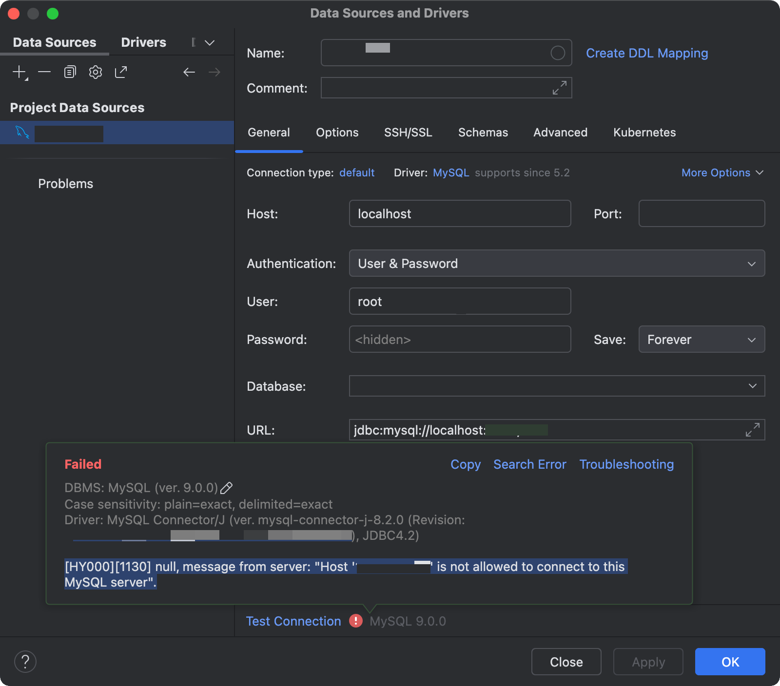 이를 해결하기 위해 MySQL 사용자 계정에 원격 접속 권한을 부여해보자.