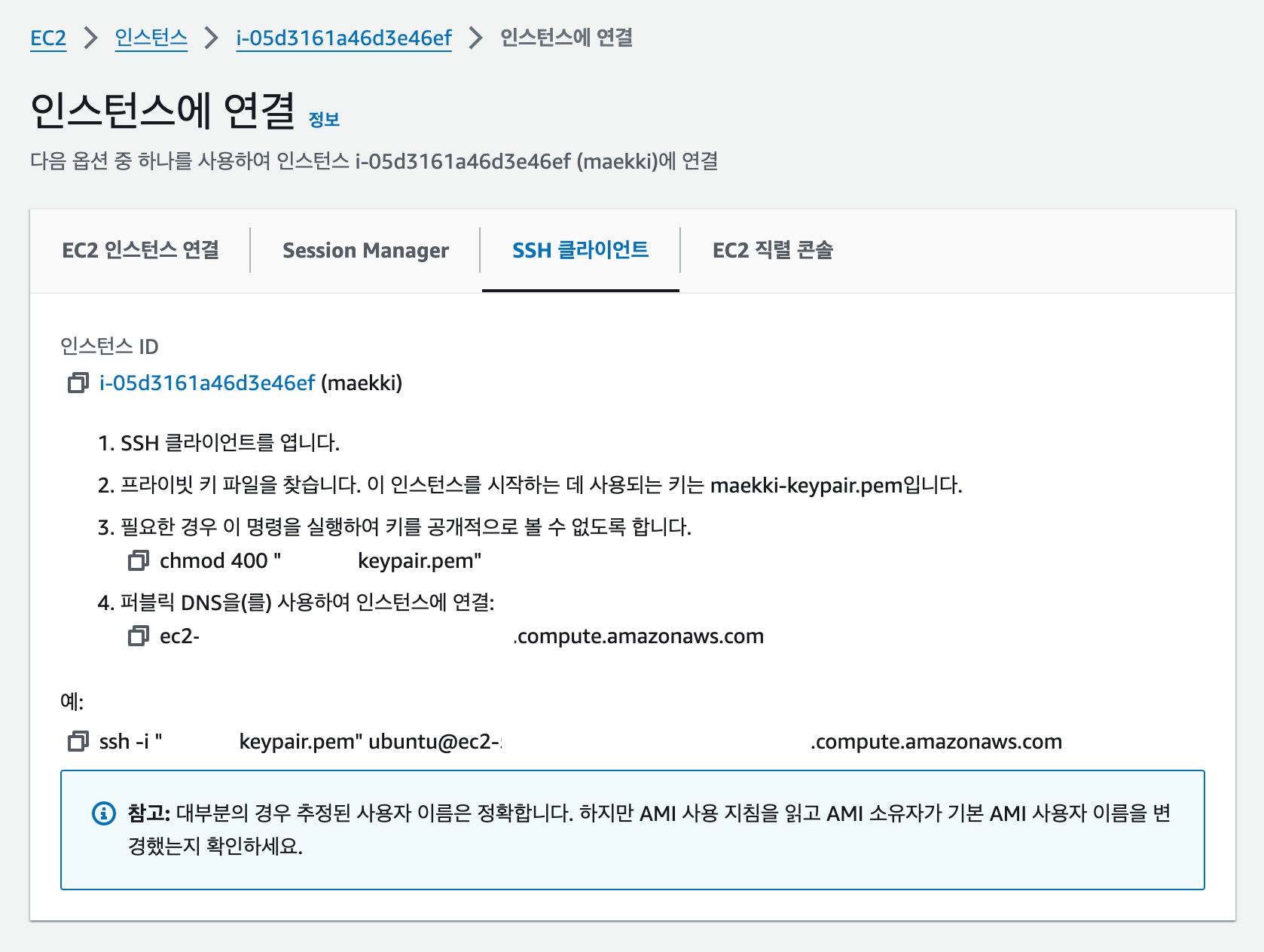 AWS 로그인 > EC2 > 인스턴스 > 실행할 인스턴스 선택 > 연결 > SSH 클라이언트