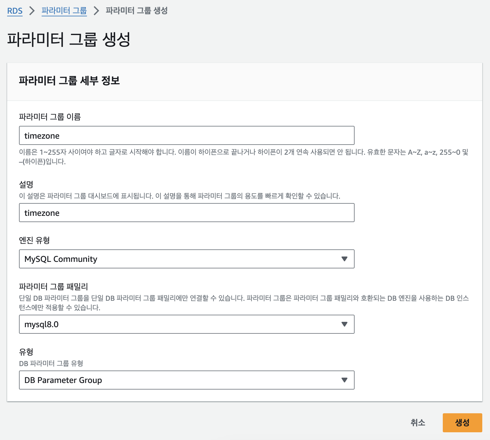 사용 중인 RDS 인스턴스에 맞게 설정한 후 파라미터 그룹 이름과 설명을 입력한다.