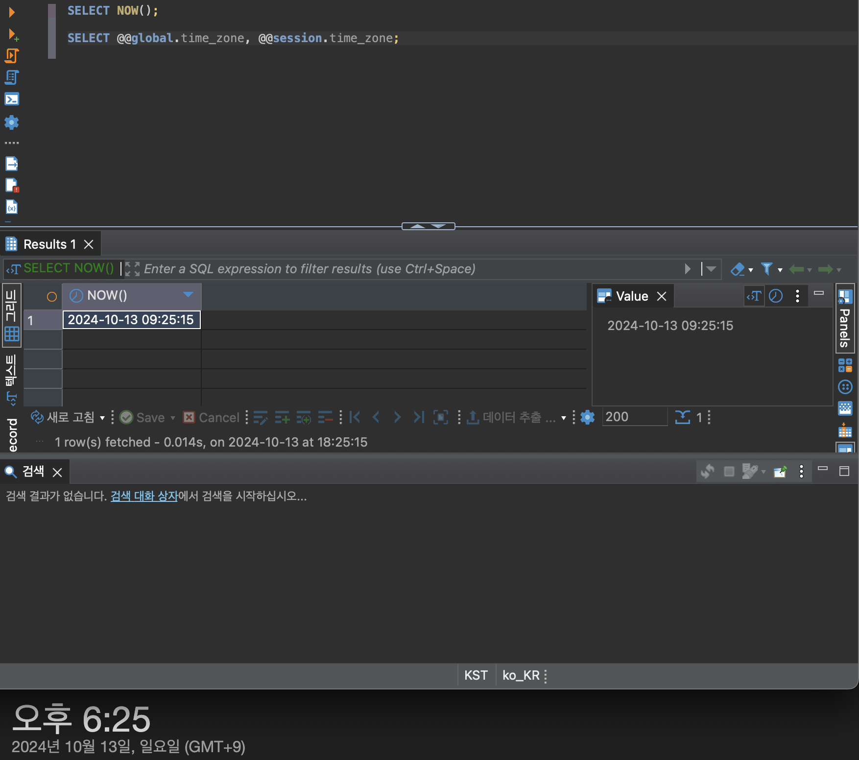 NOW() 함수로 현재 시간이 표시되는지, 출력 결과가 Asia/Seoul로 변경되었는지 확인한다.