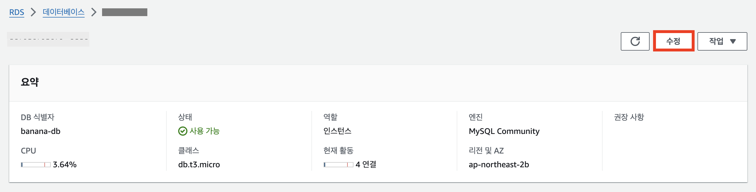 이제 RDS 인스턴스에서 새로 만든 파라미터 그룹을 적용한다. RDS 인스턴스를 선택하고 수정 버튼을 클릭한다.