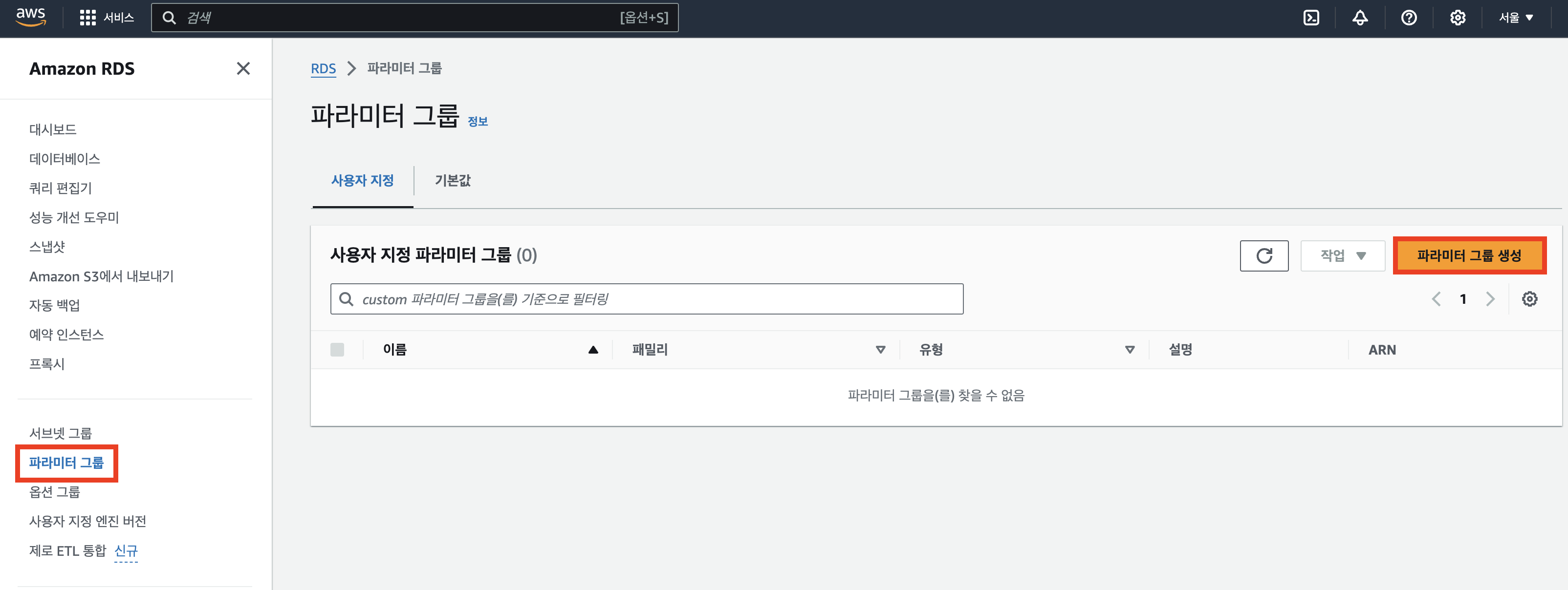 RDS 페이지로 이동하여 파라미터 그룹 생성 버튼을 클릭한다.