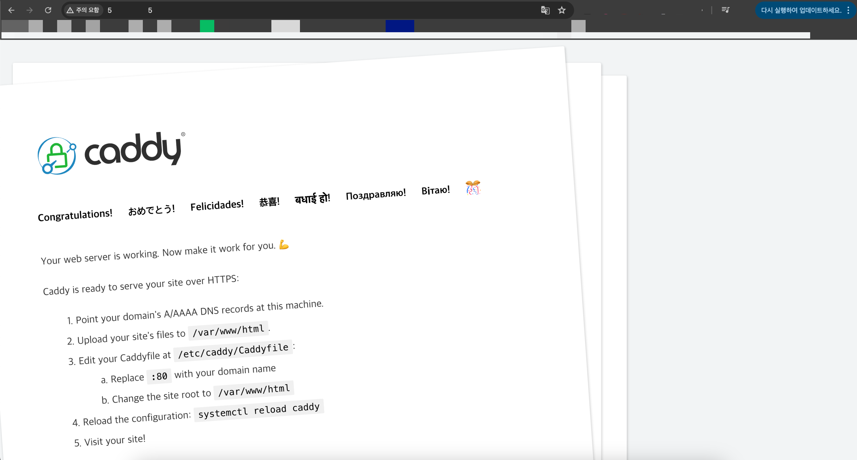 Caddy를 다시 시작하면 Caddy 홈페이지가 아닌 자신의 홈페이지가 뜰 것이다.
