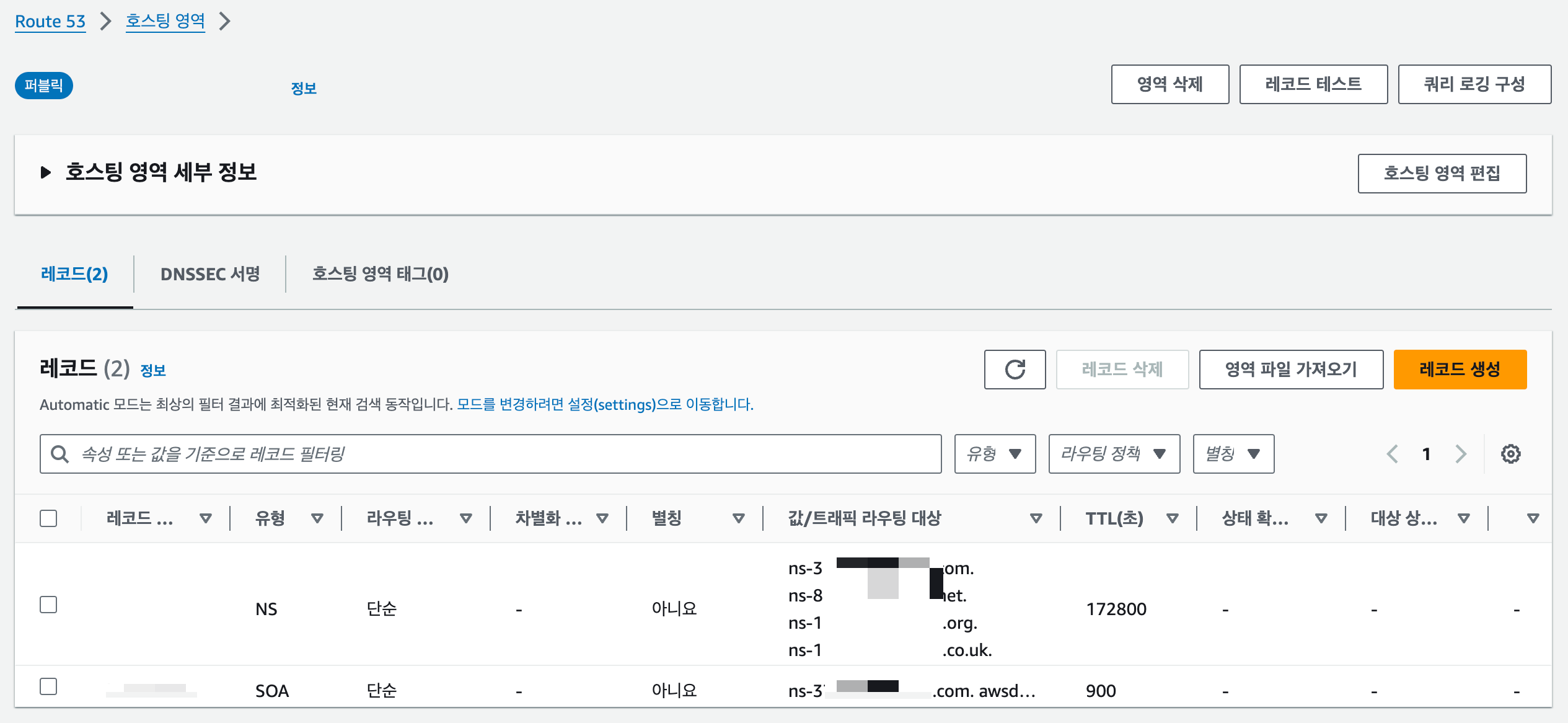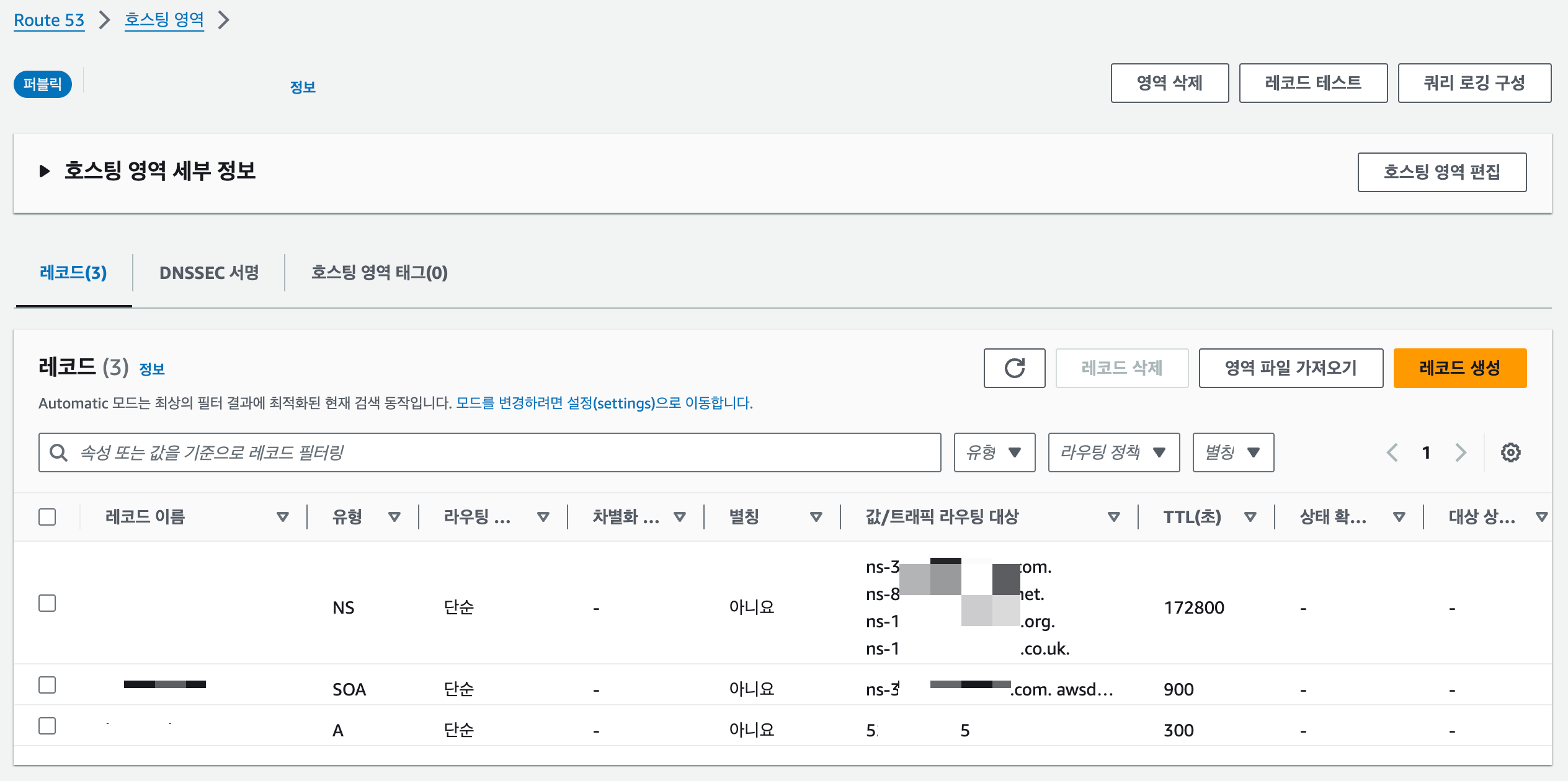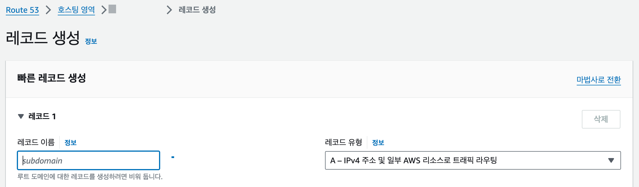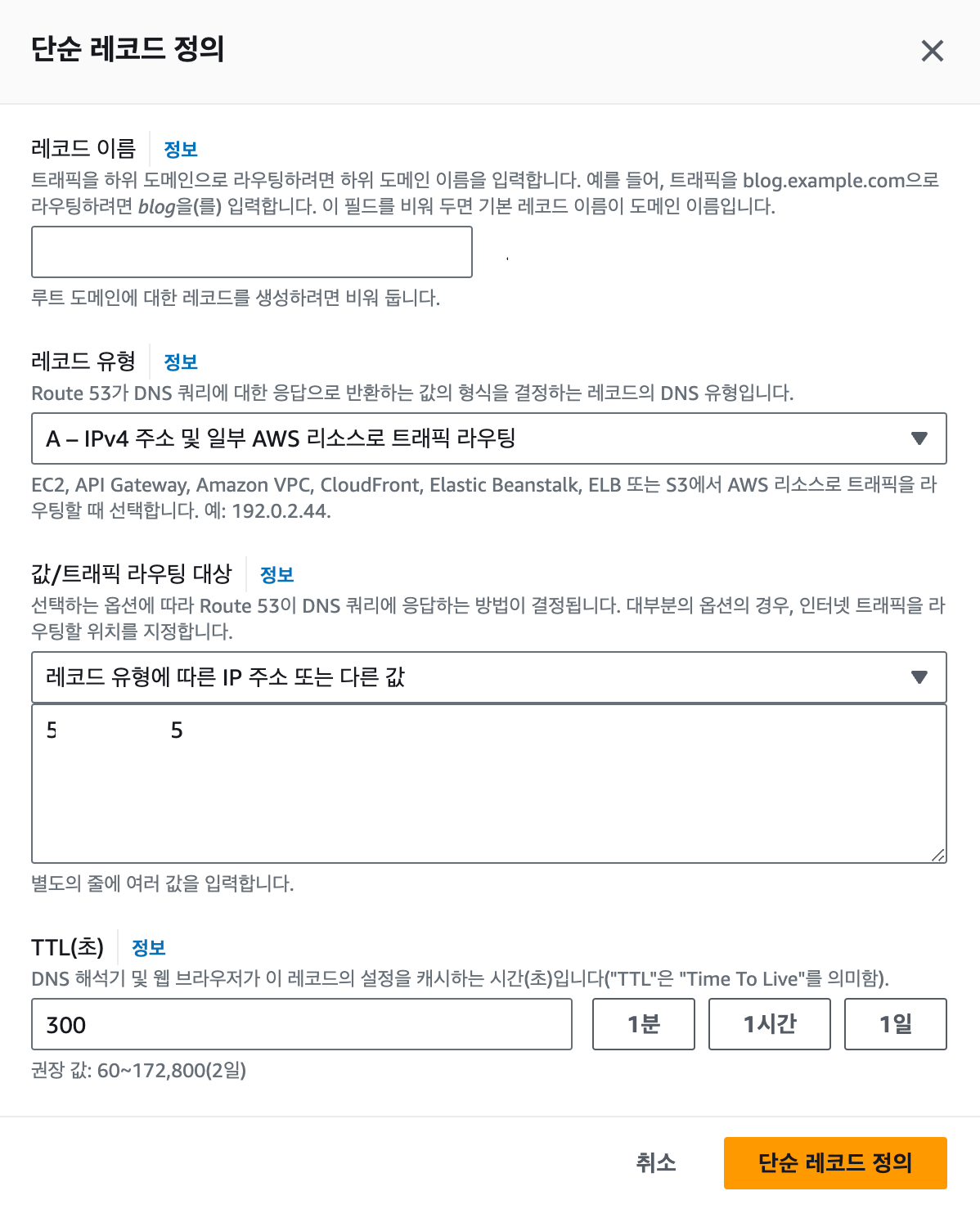 | 값/트래픽 라우팅 대상⎜레코드 유형에 따른 IP 주소 또는 다른 값 | EC2 인스턴스 퍼블릭 IPv4 주소 입력 |